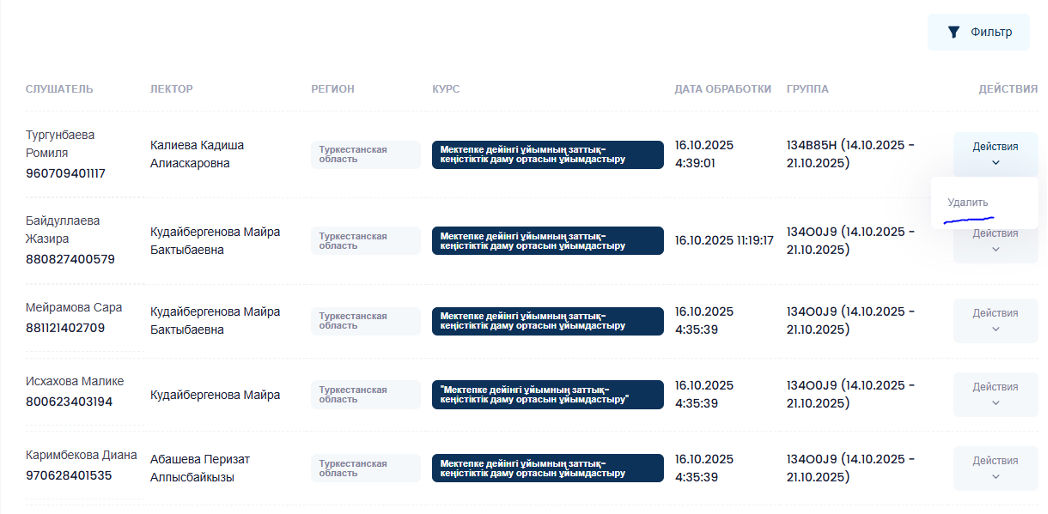 ⚠️ Если в личных данных слушателя (ИИН, ФИО и т.д.) обнаружены ошибки, необходимо обратиться в Учебный департамент Центрального Аппарата для их корректировки.