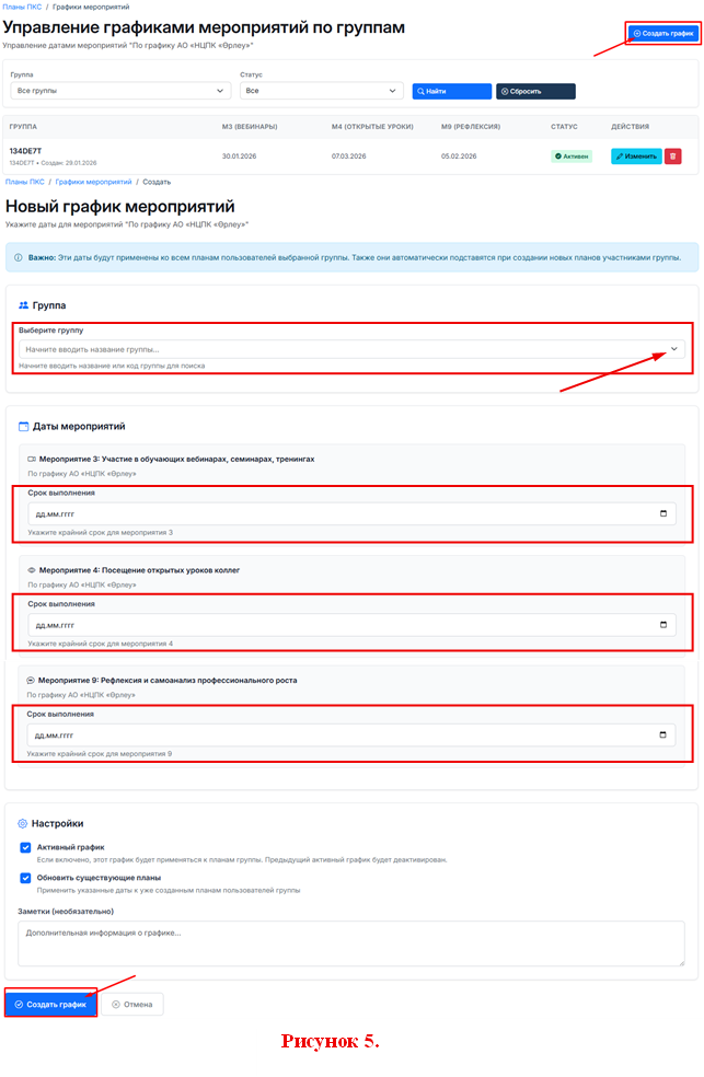 6. В открывшемся окне необходимо нажать кнопку «Создать график», после чего откроется новое окно для заполнения графика мероприятий. Куратору необходимо выбрать группу, указать даты проведения мероприятий (сроки выполнения) и в завершение нажать кнопку "Создать график" (см. рисунок 5).