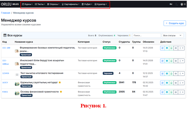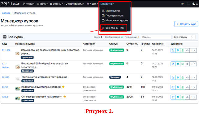 1. Каждый преподаватель (далее - Куратор) входит на платформу ПКС, используя свои учётные данные, по следующему адресу: https://beles.orleu.edu.kz/courses/cms/instructor/