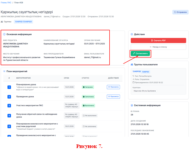 8. После просмотра планов педагогов куратору необходимо их согласовать. Для этого в верхней части страницы, в блоке с основной информацией, справа необходимо нажать кнопку "Согласовать" (см. рисунок 7).