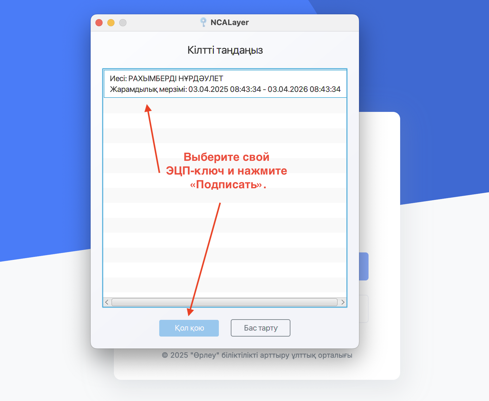 Выберите свой ключ (с вашим именем) и нажмите «Қол қою» (Подписать).