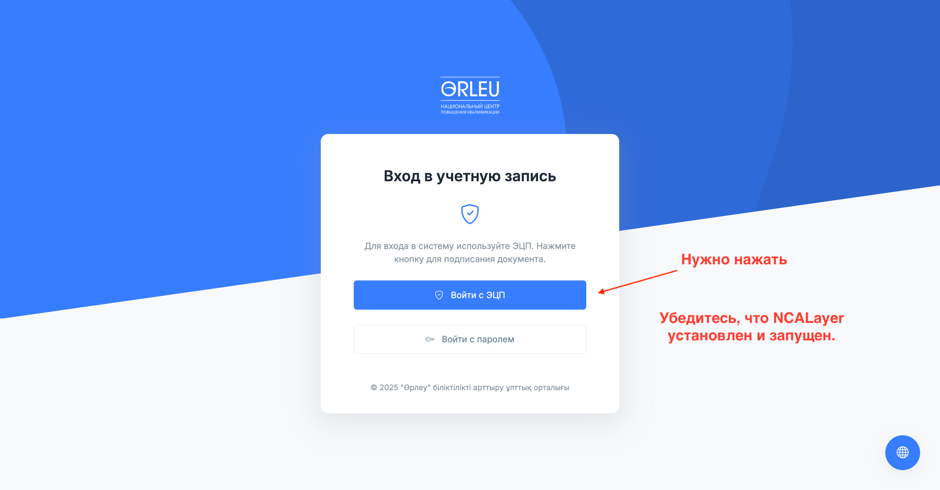 Перед этим убедитесь, что NCALayer установлен и запущен на вашем компьютере.