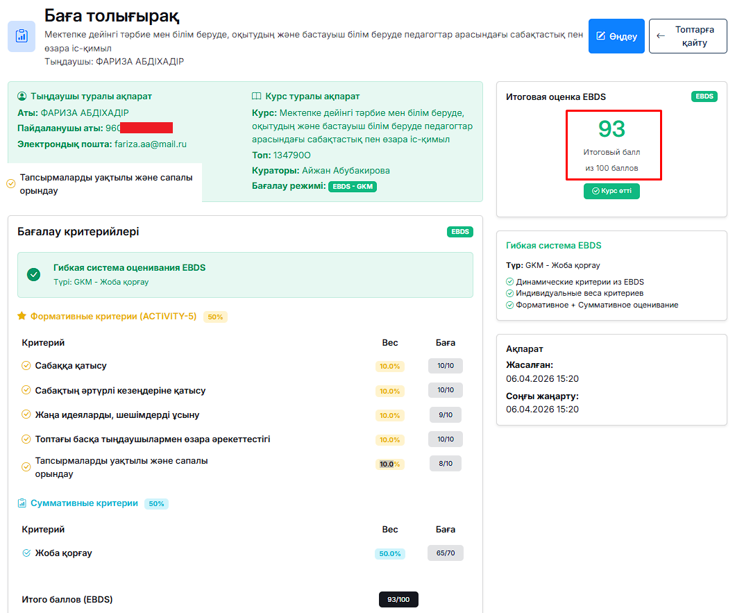 Қажет болған жағдайда «Куратордың түсініктемелері» өрісіне пікір қалдыра аласыз. Содан кейін «Бағаны сақтау» батырмасын басыңыз (5-сур. қараңыз).
