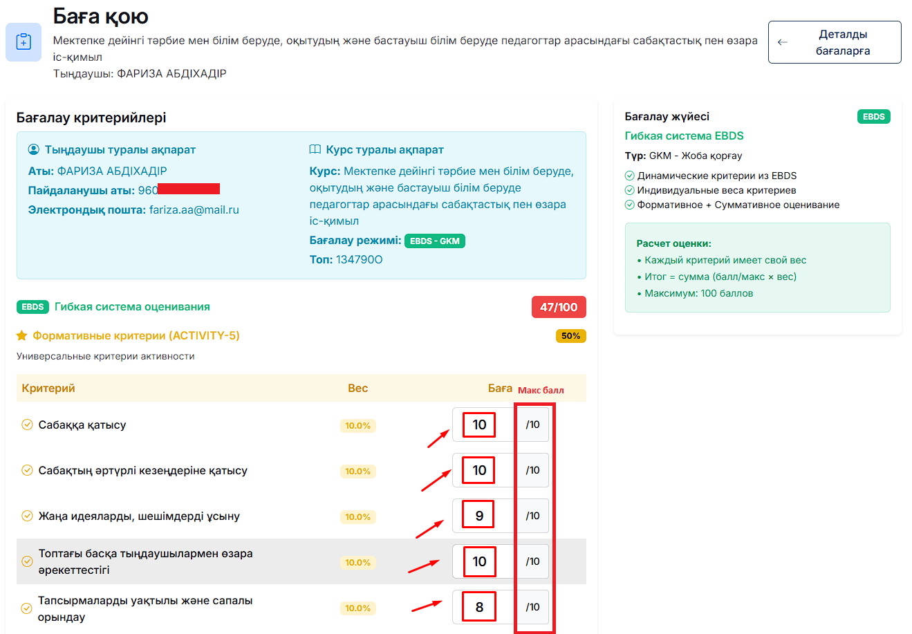 • формативті критерийлер үшін (4-сур. қараңыз, баға қою өрісінің оң жағында ең жоғарғы балл көрсетілген);
