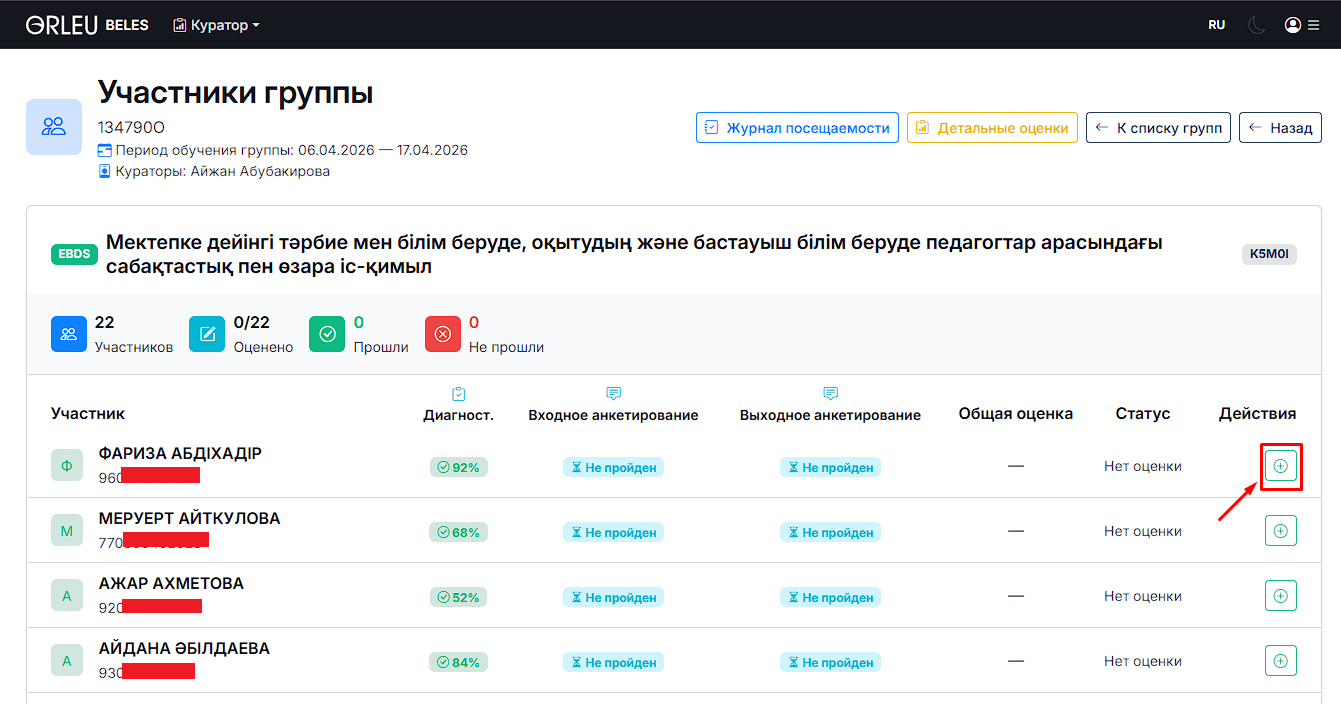 Нажмите «+» в столбце «Действия» напротив оцениваемого участника (см. Рис. 3).