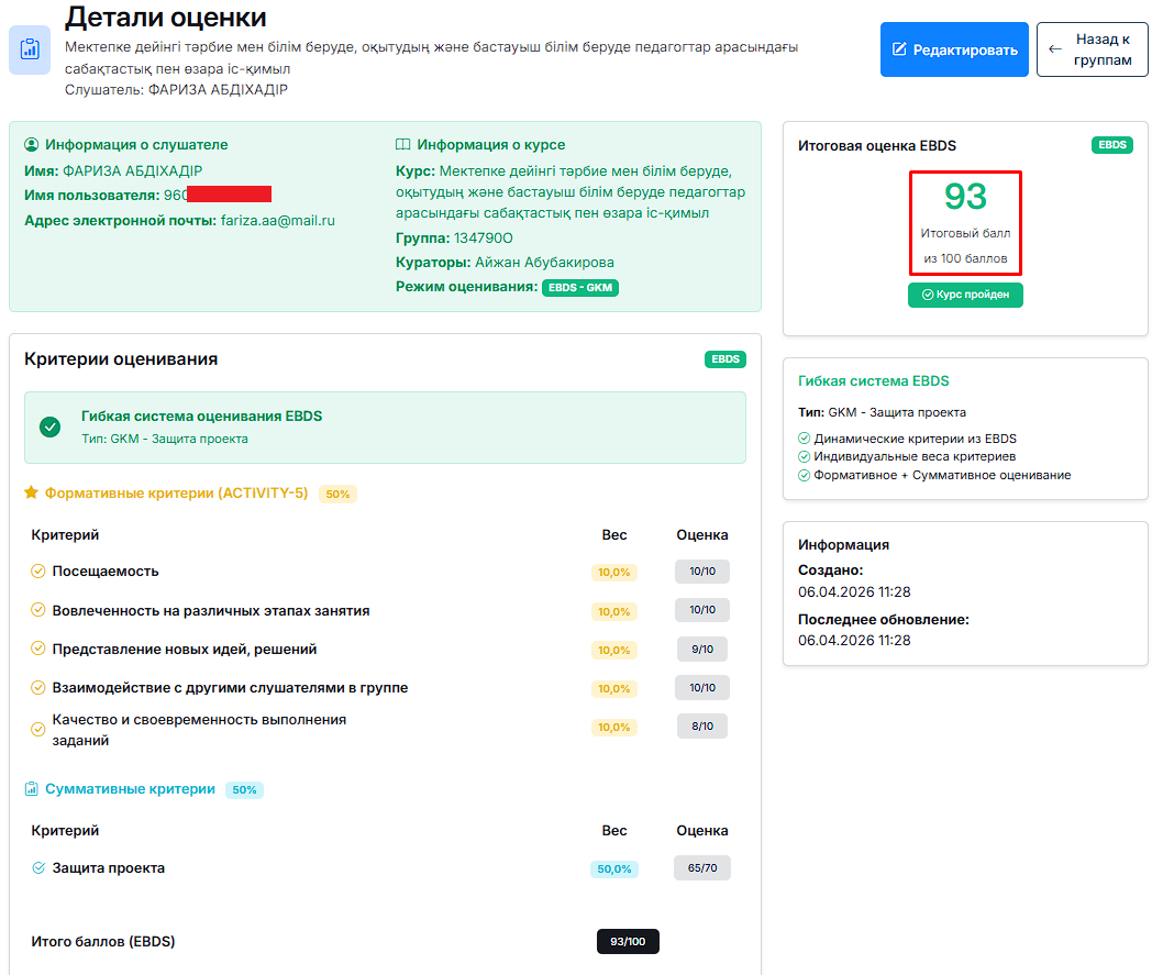 После сохранения оценки вас перекидывает на страницу «Детали оценки», где вы можете ещё раз проверить правильность выставления оценки (см. Рис. 6). Для остальных участников повторите процедуру.