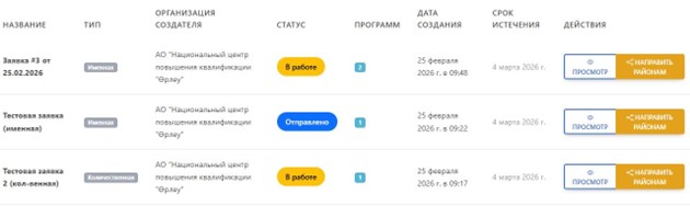 • Өтінімдер тізімінің мониторингі. «Мои заявки» бөліміне өтіңіз. Мұнда біліктілікті арттыру (БА) ұйымдарынан сіздің облыстық әдістемелік орталыққа жіберілген барлық өтінімдер көрсетіледі. Тізім автоматты түрде келіп түскен күні бойынша сұрыпталады. • Сүзгілерді пайдалану. Іздеуге ыңғайлы болу үшін жоғарғы сүзгілеу панелін пайдаланыңыз. Өтінімдерді атауы, түрі (атаулы немесе сандық), мәртебесі, нақты БА ұйымы немесе күндер аралығы бойынша сүзгіден өткізе аласыз.
