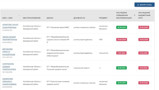 • Тізімді қарау. Жоғарғы мәзірдегі «Педагогтер» бөліміне өтіңіз. Алдыңызда облыстың барлық педагогтері бар кесте ашылады, онда соңғы біліктілікті арттыру және бюджеттік курстан өту күні бірден көрінеді. • Мәліметтерді экспорттау. Қажет болған жағдайда кестенің үстіндегі «Экспорт в Excel» түймесін басу арқылы педагогтердің ағымдағы тізімін Excel форматында жүктей аласыз.