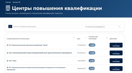 • Орталықтарды қарау. «Организации ПК» бөліміне өтіңіз. Мұнда біліктілікті арттыру орталықтарының тізімі, олардың БСН-і (БИН) және бекітілген бағдарламаларының саны көрсетіледі. • Бағдарламаларды зерделеу. Қызықтырған ұйымның тұсындағы «Программы» түймесін басыңыз. Келісу күні, бағыты және тыңдаушылардың нысаналы санаты көрсетілген бекітілген білім беру бағдарламаларының толық тізімі ашылады.
