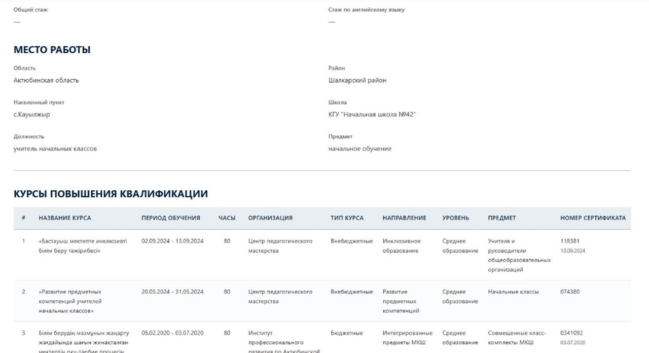 • Толық ақпарат. Нақты педагогтің жеке карточкасын ашу үшін оның ТАӘ-не басыңыз. Онда жеке деректер, жұмыс орны, сондай-ақ сертификат нөмірлері көрсетілген біліктілікті арттыру курстарының толық тарихы қолжетімді.