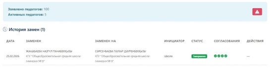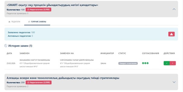 • Ауыстыру сұраныстарын өңдеу. Егер аймақ «Жедел ауыстыруға» сұраныс жіберсе, тиісті бағдарламаның мәліметтеріне кіріп, «Жедел ауыстырулар» қосымша бетіне өтіңіз. Ауыстыру себебін және жаңа педагогтің деректерін тексеріп, содан кейін «Мақұлдау» немесе «Қабылдамау» түймесін басыңыз.