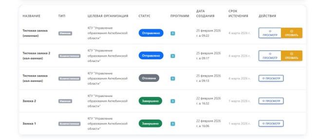 • Қолжетімді әрекеттер. Өтінімдер кестесіндегі «Әрекеттер» (Действия) бағанында келесілерді орындай аласыз: • Қарау: өтінімнің ішкі мазмұнын көру үшін қарау белгішесін басыңыз. • Қайтарып алу: егер өтінім аймаққа жіберіліп қойса, бірақ қате табылса, оны өңдеуге қайтаруға болады (облыс оны жұмысқа алғанға дейін түйме белсенді болады). • Жою: егер өтінім «Черновик» мәртебесінде болса және ол енді қажет болмаса.