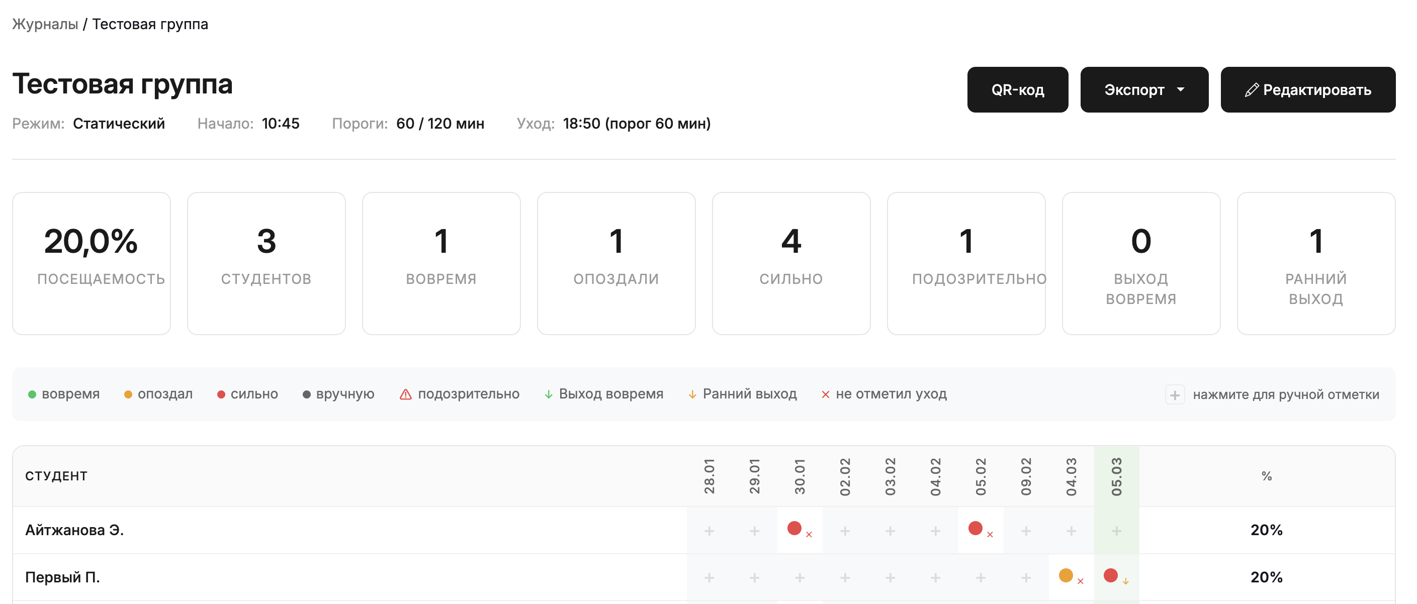 В системе предусмотрена функция фиксации посещаемости занятий преподавателями. Данная функция позволяет автоматически регистрировать факт проведения урока, а также фиксировать время прибытия преподавателя на занятие и время его ухода после завершения урока. Снимок экрана 2026-03-05 в 19.21.27.png Фиксация осуществляется с использованием мобильного устройства путем сканирования специального QR-кода в начале и в конце занятия. Система автоматически сохраняет дату и точное время регистрации, что позволяет обеспечить прозрачный учет посещаемости и контроль соблюдения расписания. Снимок экрана 2026-03-05 в 19.29.50.png В случаях, когда у студента по техническим причинам не может воспользоваться мобильным устройством (например, отсутствует телефон или нет доступа к приложению), предусмотрена возможность ручной фиксации посещения уполномоченным лицом с указанием причины. Снимок экрана 2026-03-05 в 19.31.39.png Снимок экрана 2026-03-05 в 19.25.54.png Для более гибкого управления процессом фиксации посещаемости в системе предусмотрен раздел «Редактирование группы», в котором можно настроить параметры учета времени. В данном разделе администратор или ответственное лицо может управлять временем занятия, устанавливать допустимый порог отклонения (например, для определения опоздания), а также при необходимости включать или отключать функцию фиксации времени ухода. Снимок экрана 2026-03-05 в 19.21.55.png Снимок экрана 2026-03-05 в 19.22.12.png Настоящая инструкция описывает порядок использования функции фиксации посещаемости, а также настройку параметров времени в разделе управления группой.