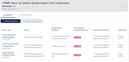 • Педагогтер тізімін қалыптастыру. Өтінімге адамдарды өз бетіңізше қосу үшін мыналарды пайдаланыңыз: o Выбрать педагогов: аудан педагогтерінің жалпы тізімі бойынша іздеу. o Выбрать кандидатов: мектептер ұсынған педагогтер тізімі. Дұрыс таңдау үшін соңғы курстан өткен күні, лауазымы немесе пәні бойынша сүзгілерді пайдаланыңыз.
