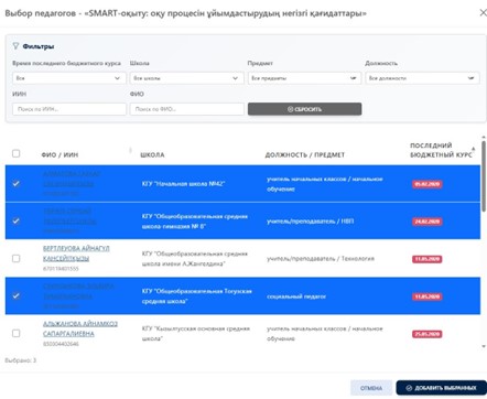 • Педагогтер тізімін қалыптастыру. Өтінімге адамдарды өз бетіңізше қосу үшін мыналарды пайдаланыңыз: o Выбрать педагогов: аудан педагогтерінің жалпы тізімі бойынша іздеу. o Выбрать кандидатов: мектептер ұсынған педагогтер тізімі. Дұрыс таңдау үшін соңғы курстан өткен күні, лауазымы немесе пәні бойынша сүзгілерді пайдаланыңыз.